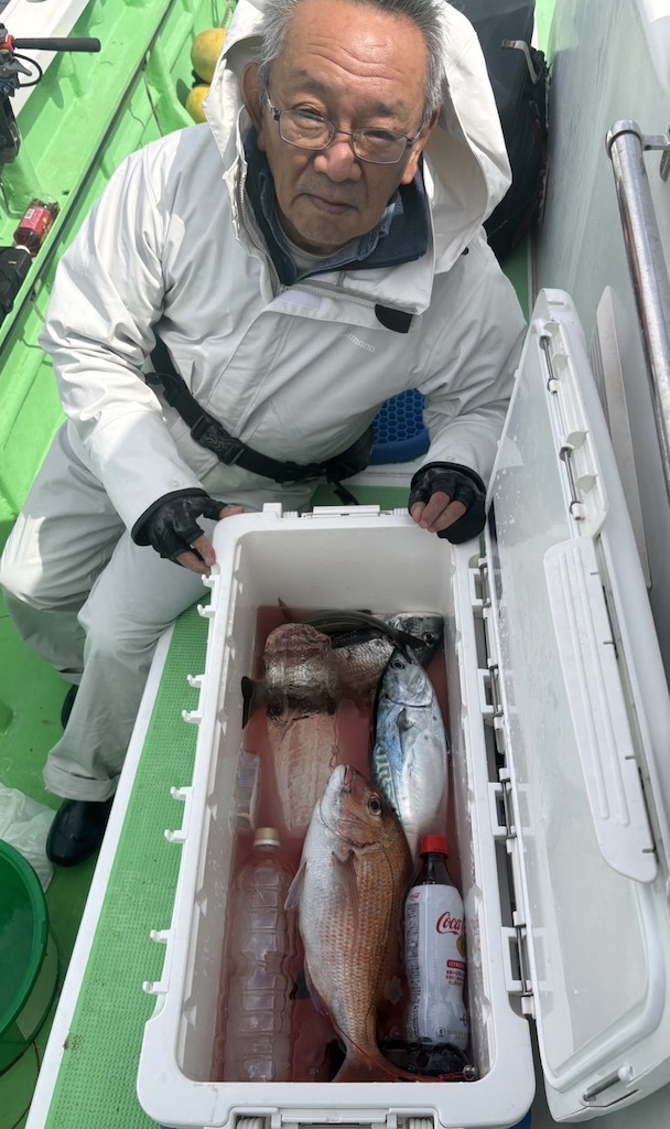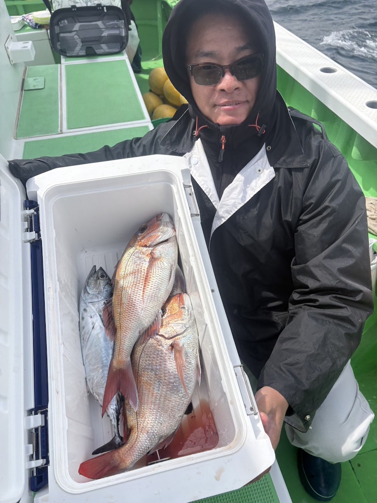 真鯛を待つ間も魚影の濃さと高活性!なんとレンタルタックルで挑戦されたビギナーのアングラーも、本命マダイをはじめ、イナダ、イサキ、アジといった豪華ゲストを次々と釣り上げ、クーラーボックスを埋め尽くすほどの怒涛のアタリを存分に楽しんでいただきました!