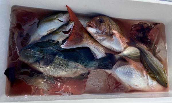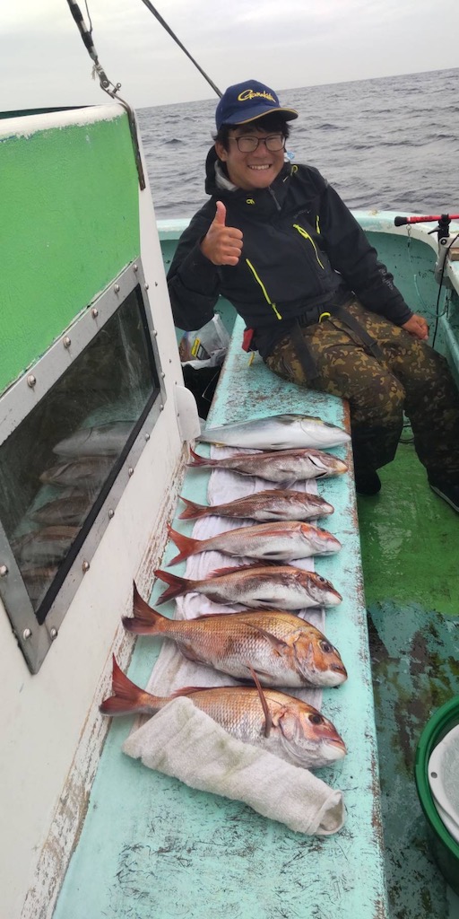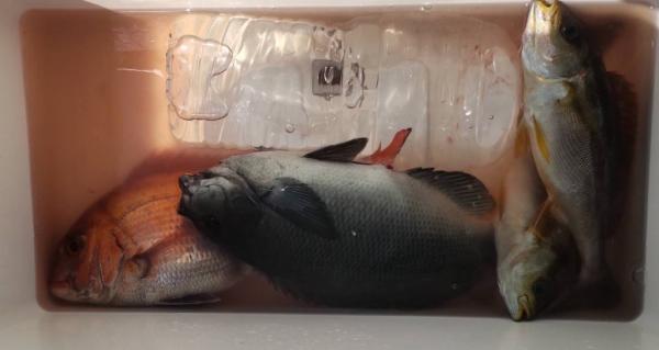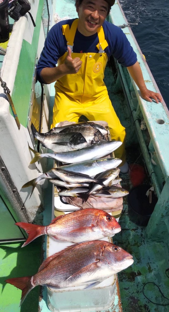 後半はポイントを転々として真鯛、黒鯛、メジナ、イサキ、イナダなどを拾い釣りとなっています。