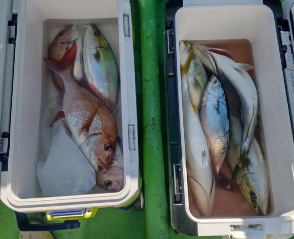 大人気の泳がせ狙い、5kgの大型ワラサと良型4kgワラサが食いつきました!さらに11時以降に入って、潮の流れが落ち着いて来たタイミングで良型真鯛も登場!