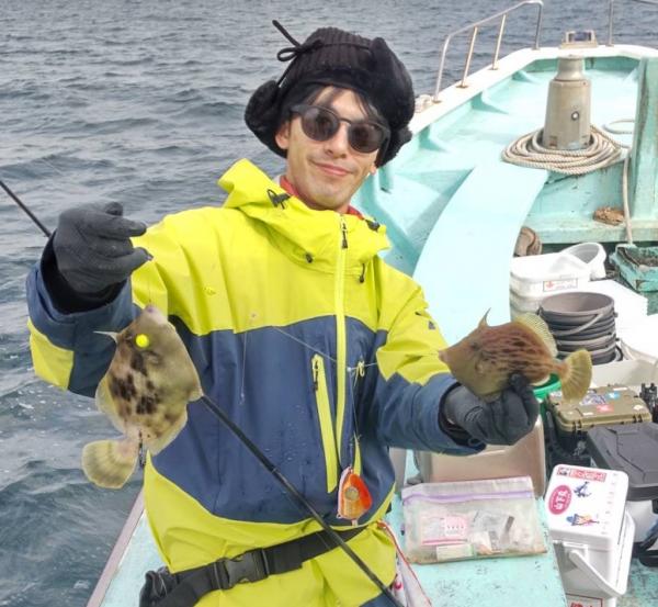 カワハギは水深20-40mラインを流してトップ10枚の二桁釣果達成、1流しに1-3枚のヒット、サイズは20cm前後を中心にヒット。