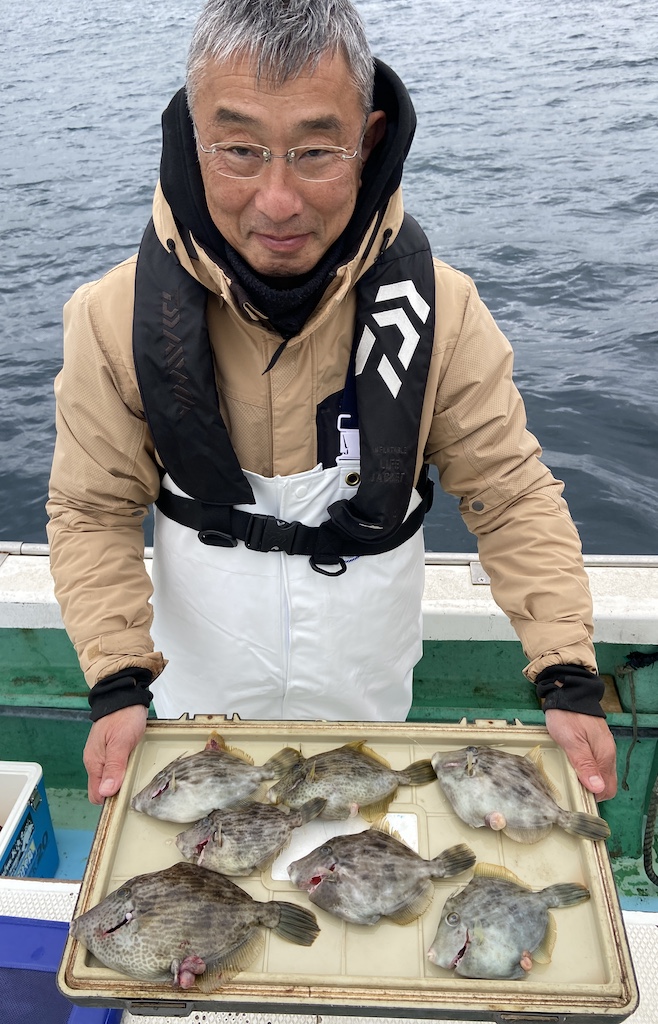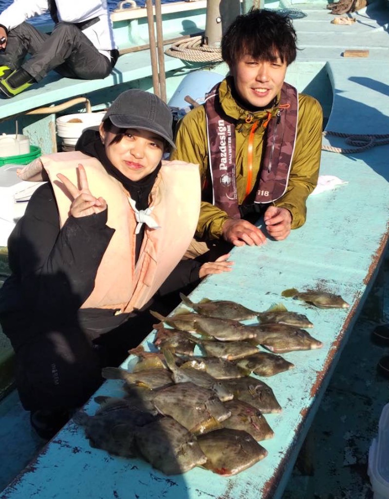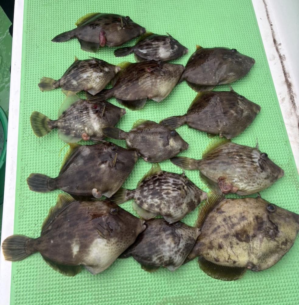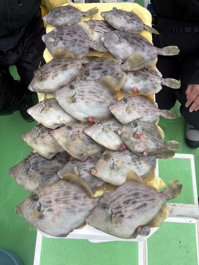 【カワハギ】剣崎沖の水深20-30mを中心に流しました。活性が高く、トップは20枚!さらにつ抜けする方も複数名様います、最大30.5cmのデカハギも登場!サイズは主に20-25cmの良型が釣れています。