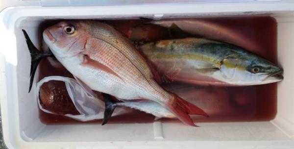 【真鯛】早朝は真鯛を求めて根っこ、漁礁など各スポットを回りました。ヒラソウダや大型サバ、イサキにイナダなどが釣れています。12時以降の潮が変わってから真鯛、3kgカンパチなどが掛かっています。