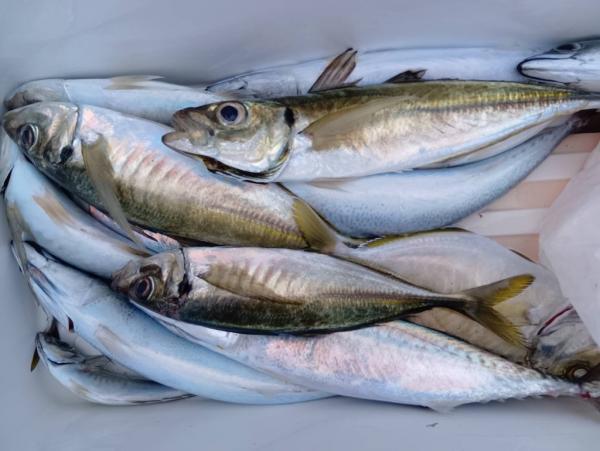 活き餌となる小アジは15cm前後を中心にポツポツと1-2点掛けでヒット。開始直後から活き餌の確保は順調!30cm超えの大型アジも数匹混じる。