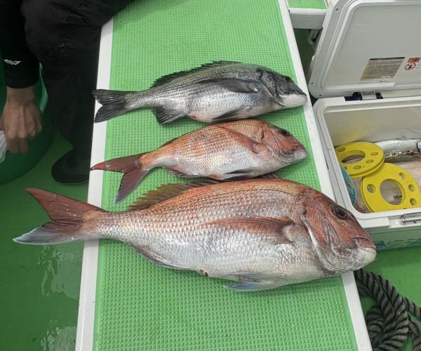 そして剣崎沖のポイントでついに本命の反応を捉え、見事マダイをゲット!トップ3枚と健闘していただきました! さらに嬉しいゲストとして、引きの強いクロダイも顔を見せています。
