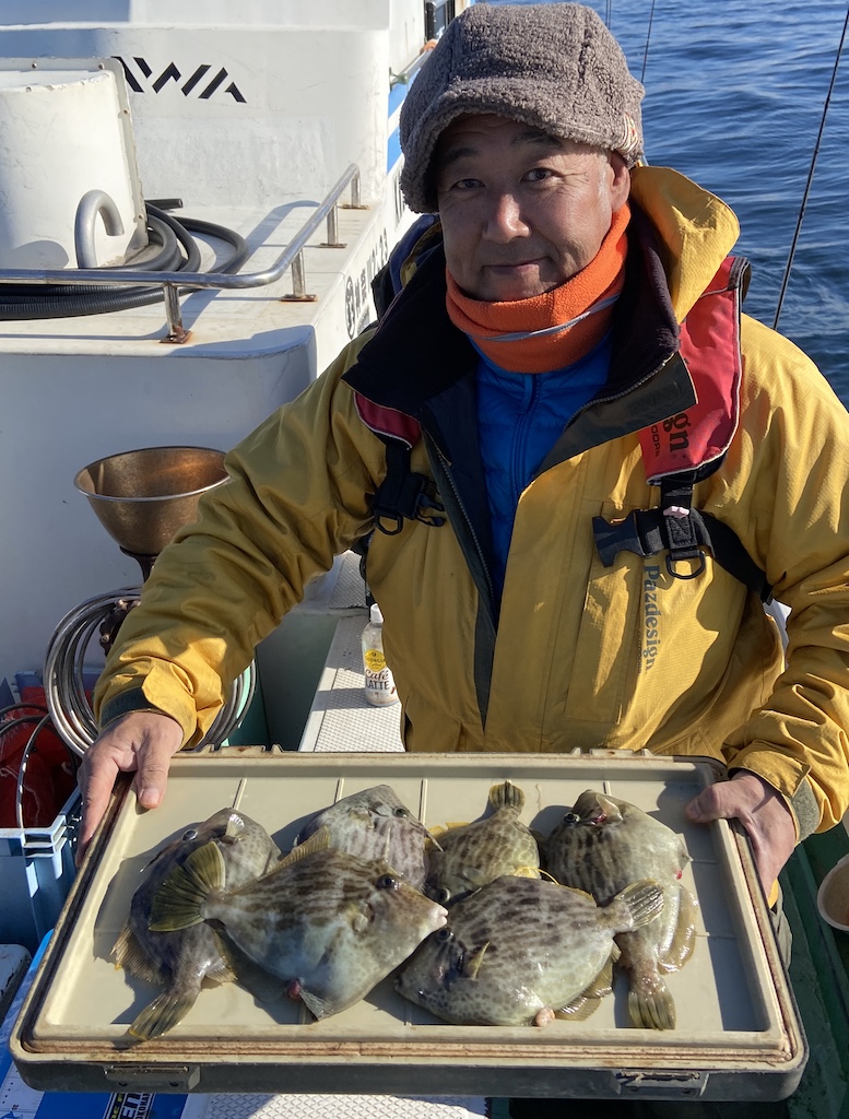 【カワハギ】トップ8枚、最大24cm!本日は剣崎沖の水深25−30mを狙い、20cm前後のカワハギがヒット。潮の流れが東、南東時はポツポツとヒットあり。後半の南方向の潮になると活性の停滞あり。